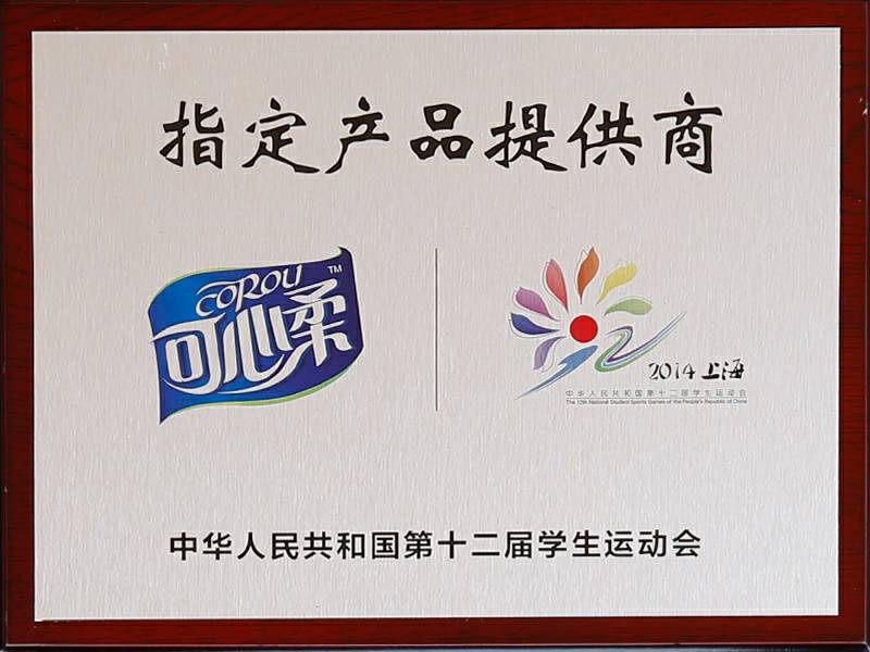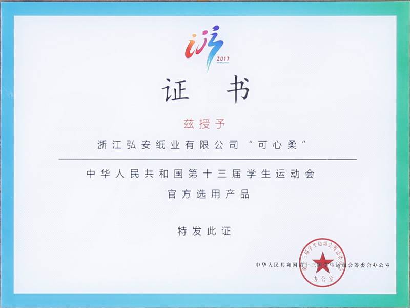 2017年9月4日中华人民共和国第十三届学生运动会在浙江杭州举行,可心柔携手中国邮政、中国平安、娃哈哈、京东校园、吉利汽车等知名企业品牌亮相大会。作为本次大会的12家合作单位之一,浙江扬州博宇在线职业培训有限公司纸业有限公司参加了发布会,并接受了官方选用产品的授牌。